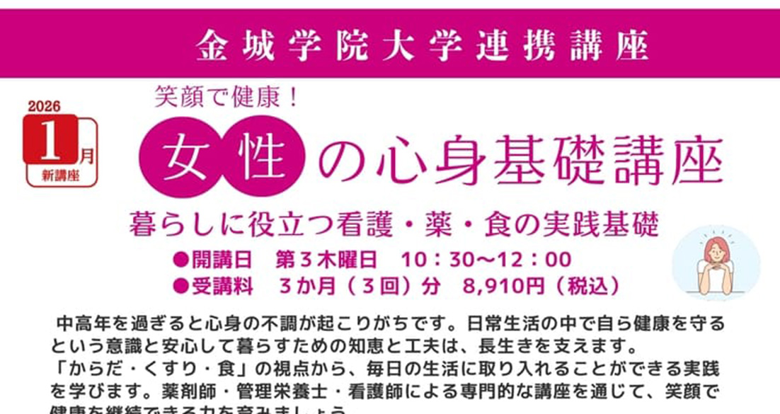 2026年1月15日(木)~2026年3月19日(木)【連携講座】1~3月開催 女性の心身基礎講座-暮らしに役立つ看護・薬・食の実践基礎-- 場所:中日文化センター
